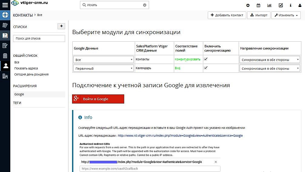 Интеграция системы Vtiger CRM с Google представляет собой синхронизацию модулей Календарь и Контакты с Календарем и Контактами gmail Google.